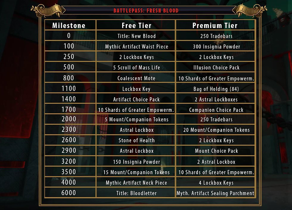 Module 31.5, The Slaughterhouse Arena, daha uzun bir Battle Pass (Slaughterhouse Frenzy) sunuyor. 1 faz (Fresh Blood) ve 16 milestone içeriyor. Arena Activities, Random Dungeons, Trials ve Skirmishes yaparak 6.000 Battle Pass XP toplayabilirsiniz. Premium Reward Track, her milestone’da ikinci bir ödül setini açar ve 1500 Zen karşılığında alınabilir. Fresh Blood’un sunduklarına bir göz atalım.